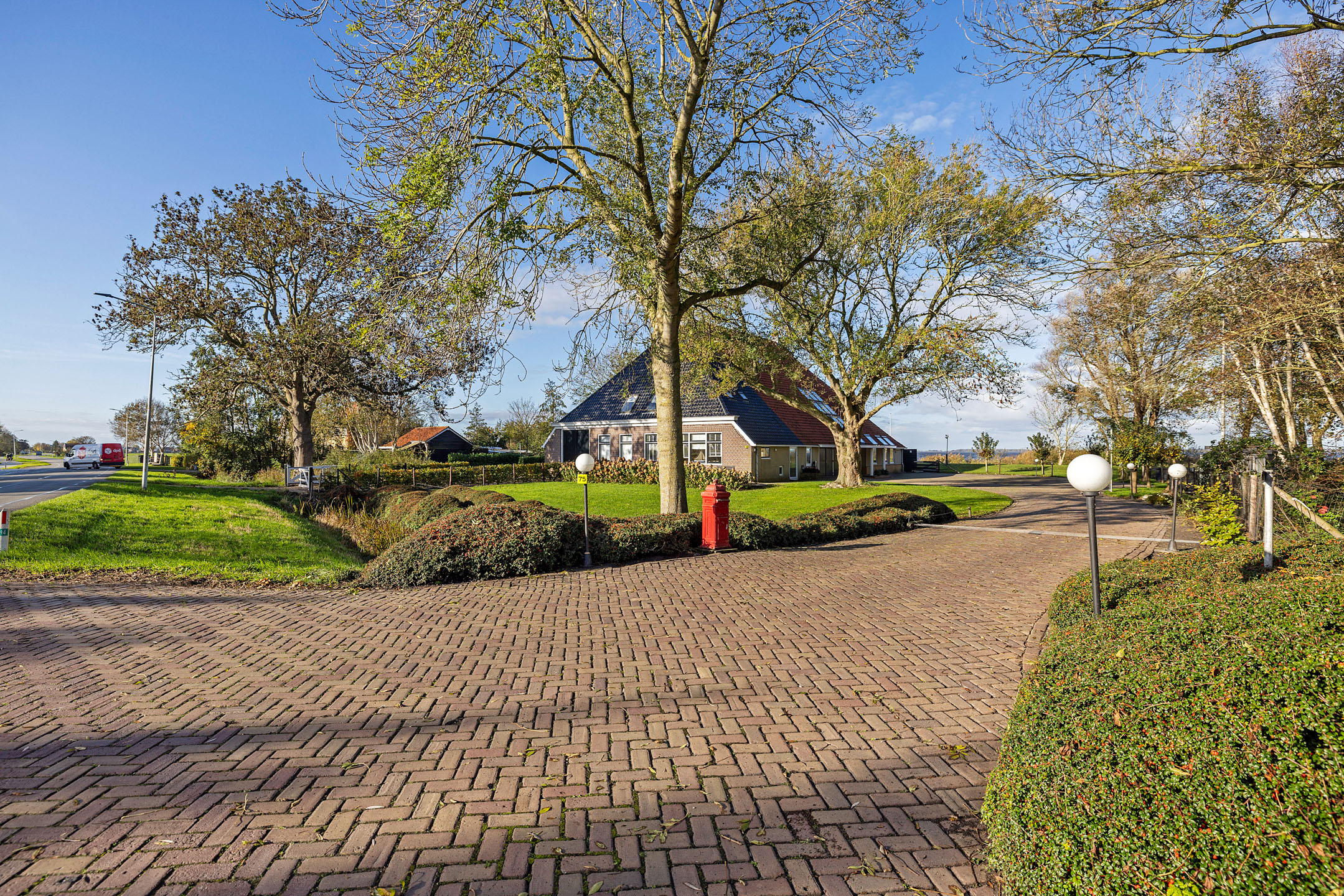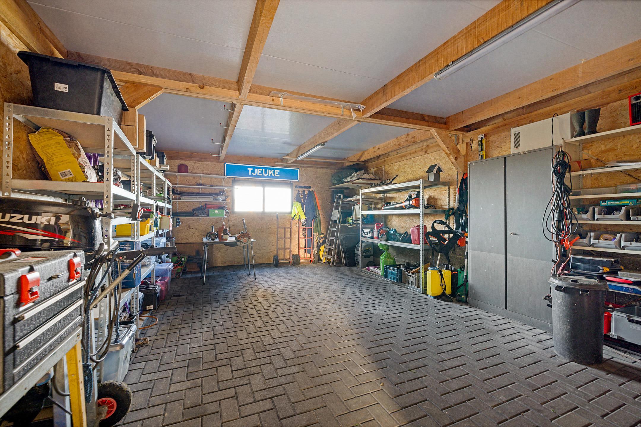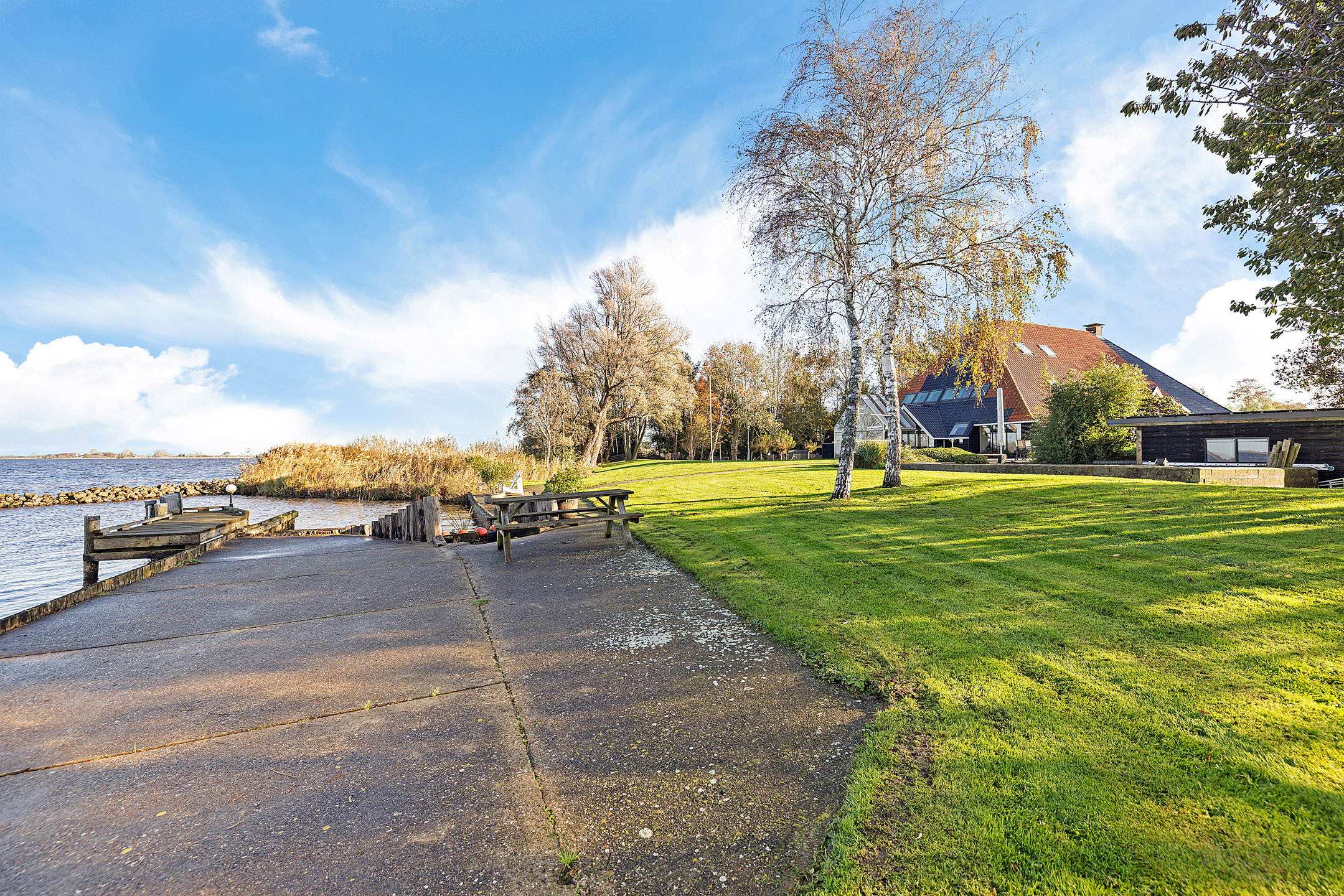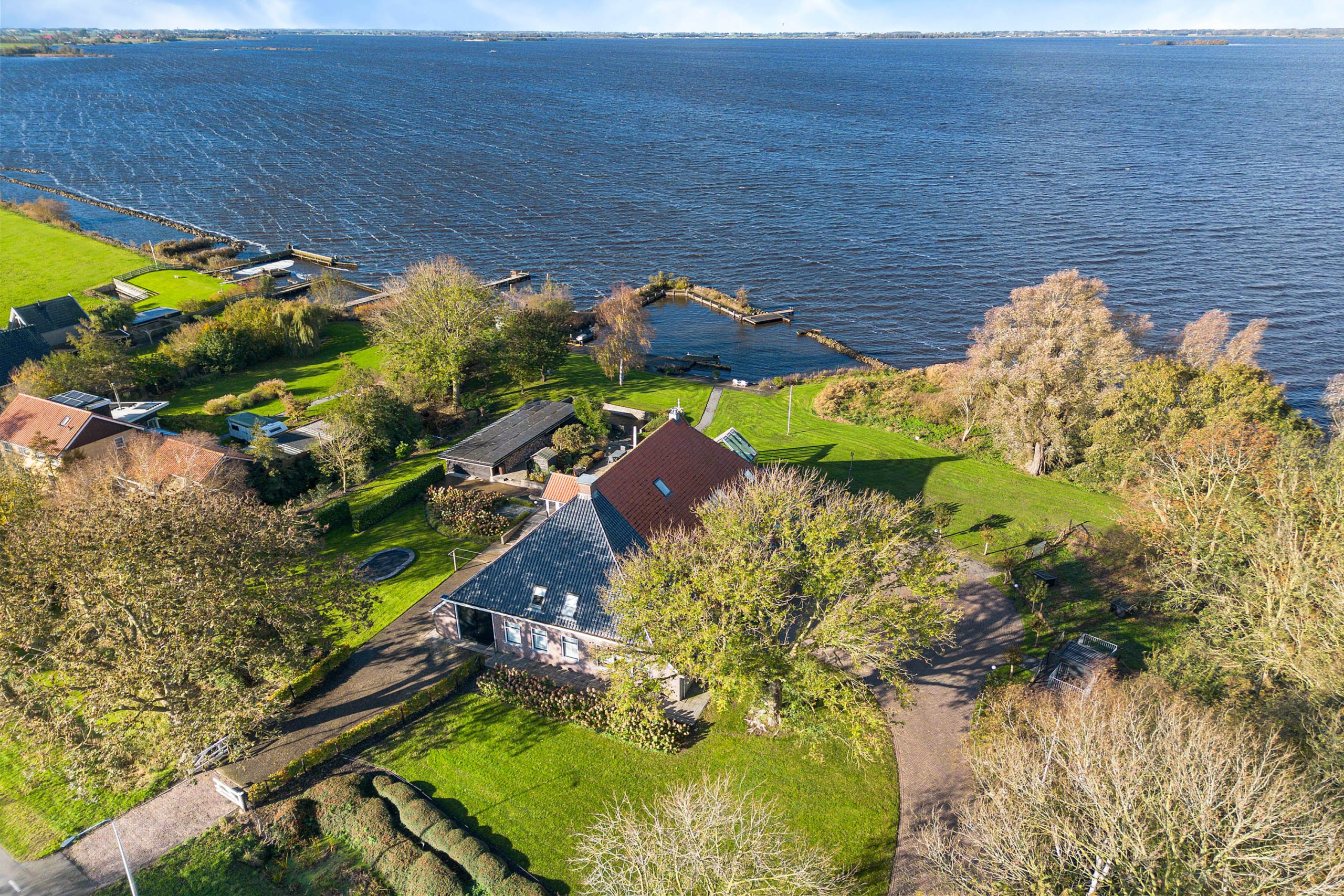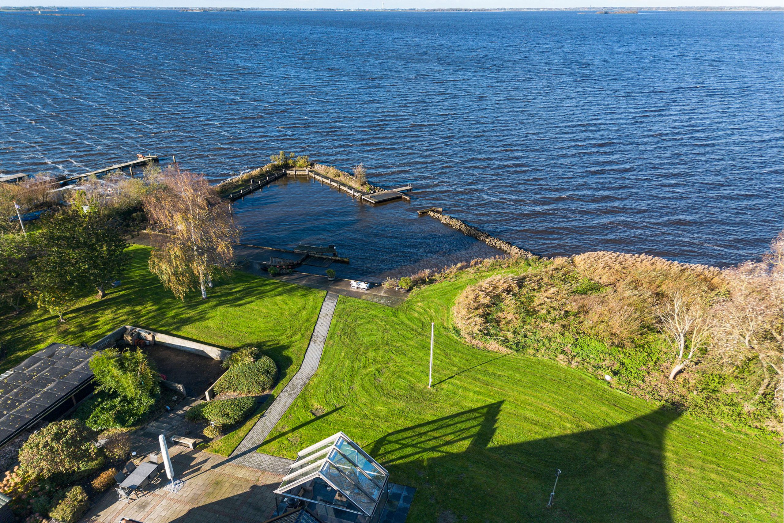 Rondom ligt een fraai aangelegde tuin van 8.830 m² eigen grond, met strakke gazons, hagen en ruime parkeervoorzieningen. Aan de waterzijde bevindt zich de eigen haven met directe toegang tot het open vaarwater van het Tjeukermeer. In 2023 is bovendien een nieuwe schuur geplaatst, voorzien van 42 zonnepanelen.