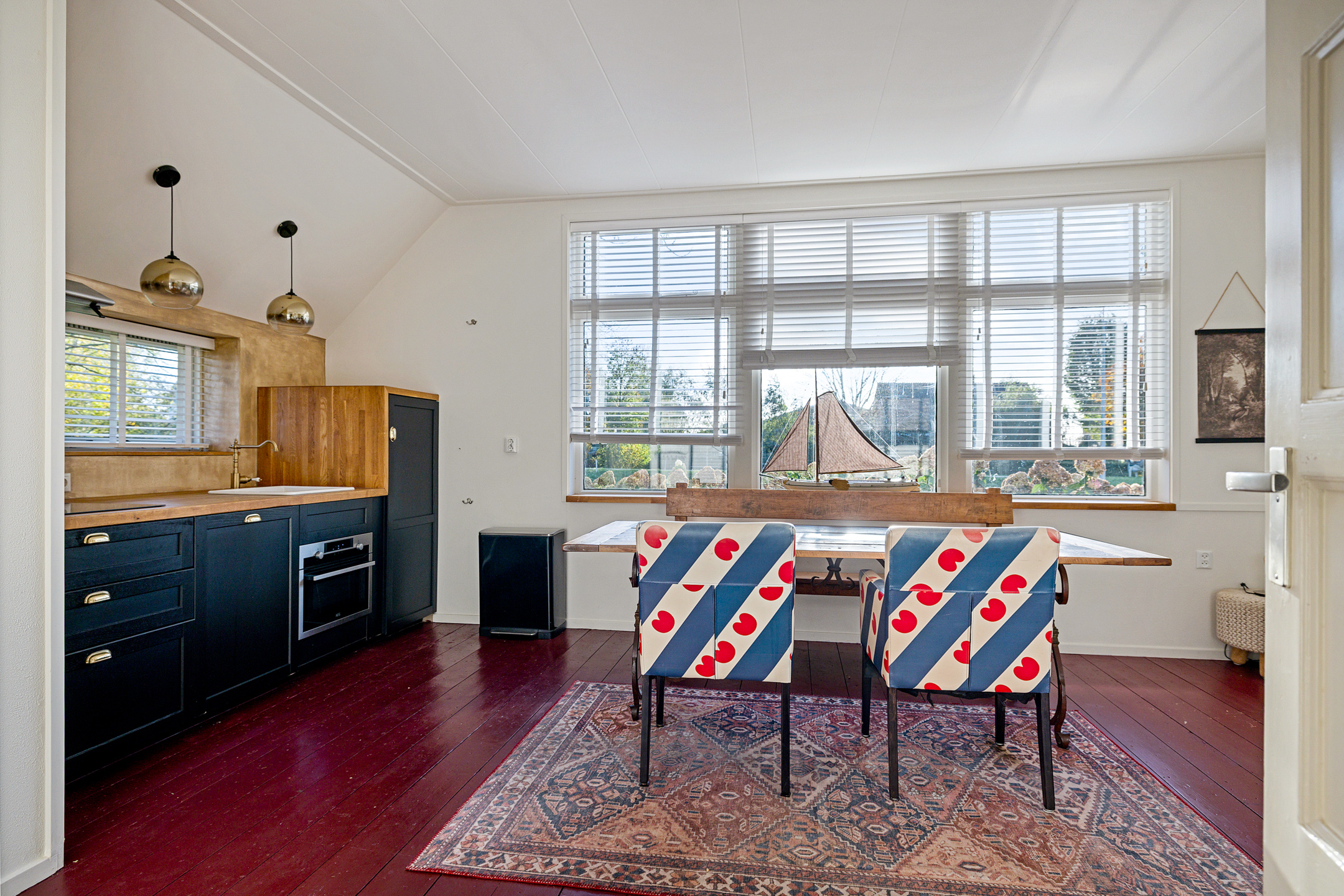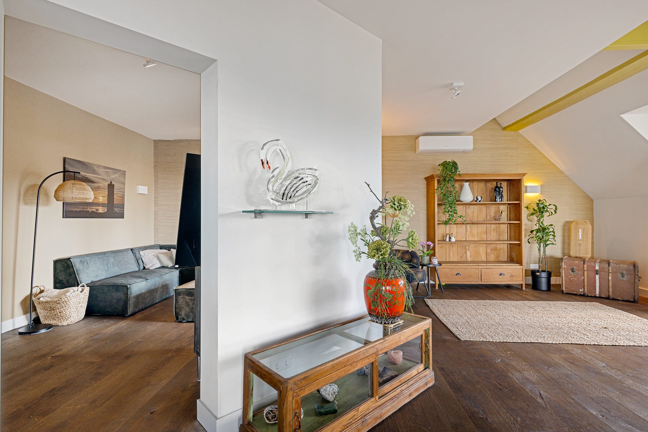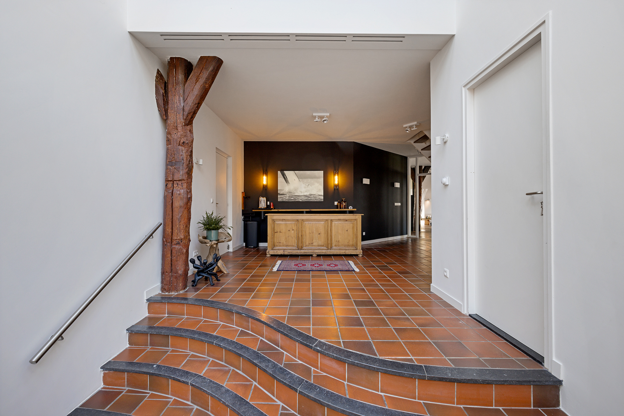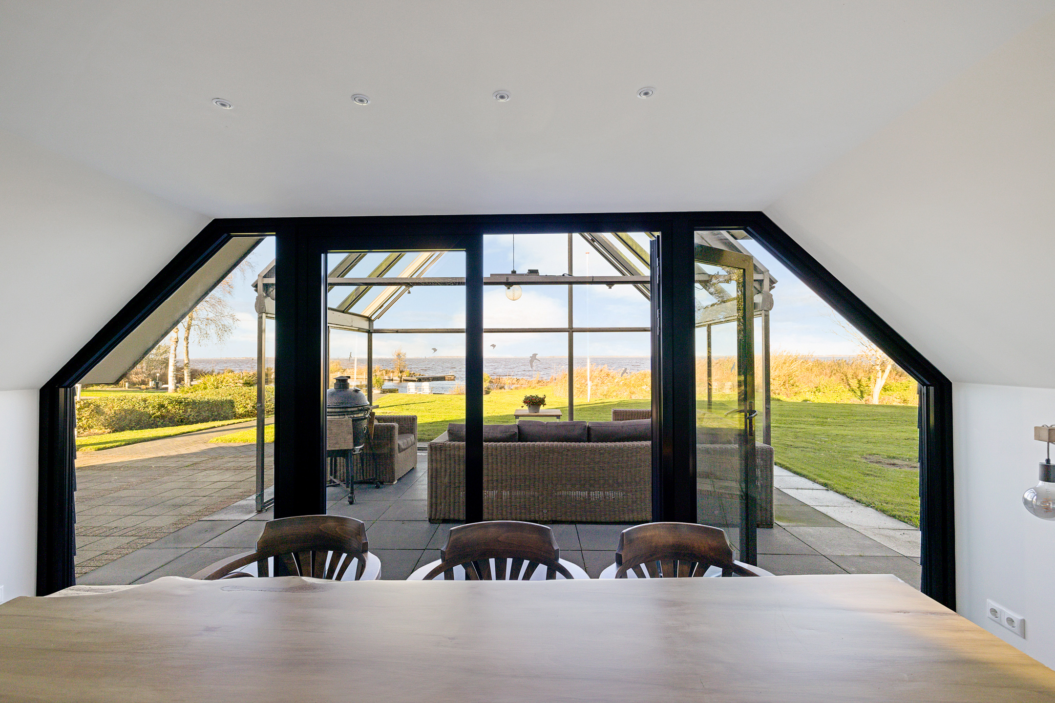 Het achterhuis, iets verhoogd gelegen, biedt een panoramisch uitzicht over het water. De woonkamer van 75,5 m² ademt ruimte en warmte dankzij de open haard, grote raampartijen en vloeiende verbinding met de tuin. De luxe keuken is volledig uitgerust met topapparatuur en vormt het hart van het huis. Vanuit de eetkamer openen de dubbele deuren naar een besloten buitenserre – een verlengstuk van het wonen, beschut en sfeervol.