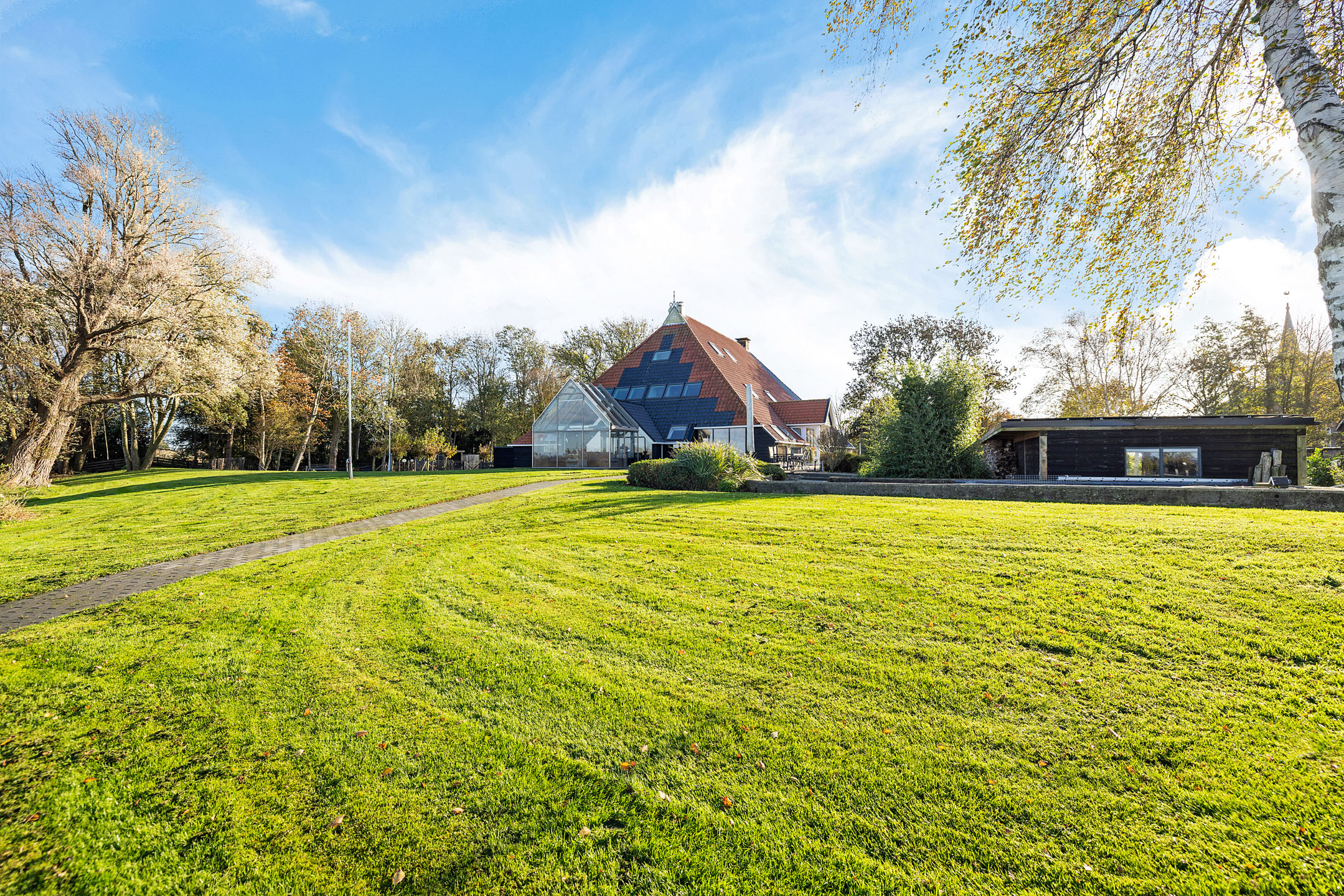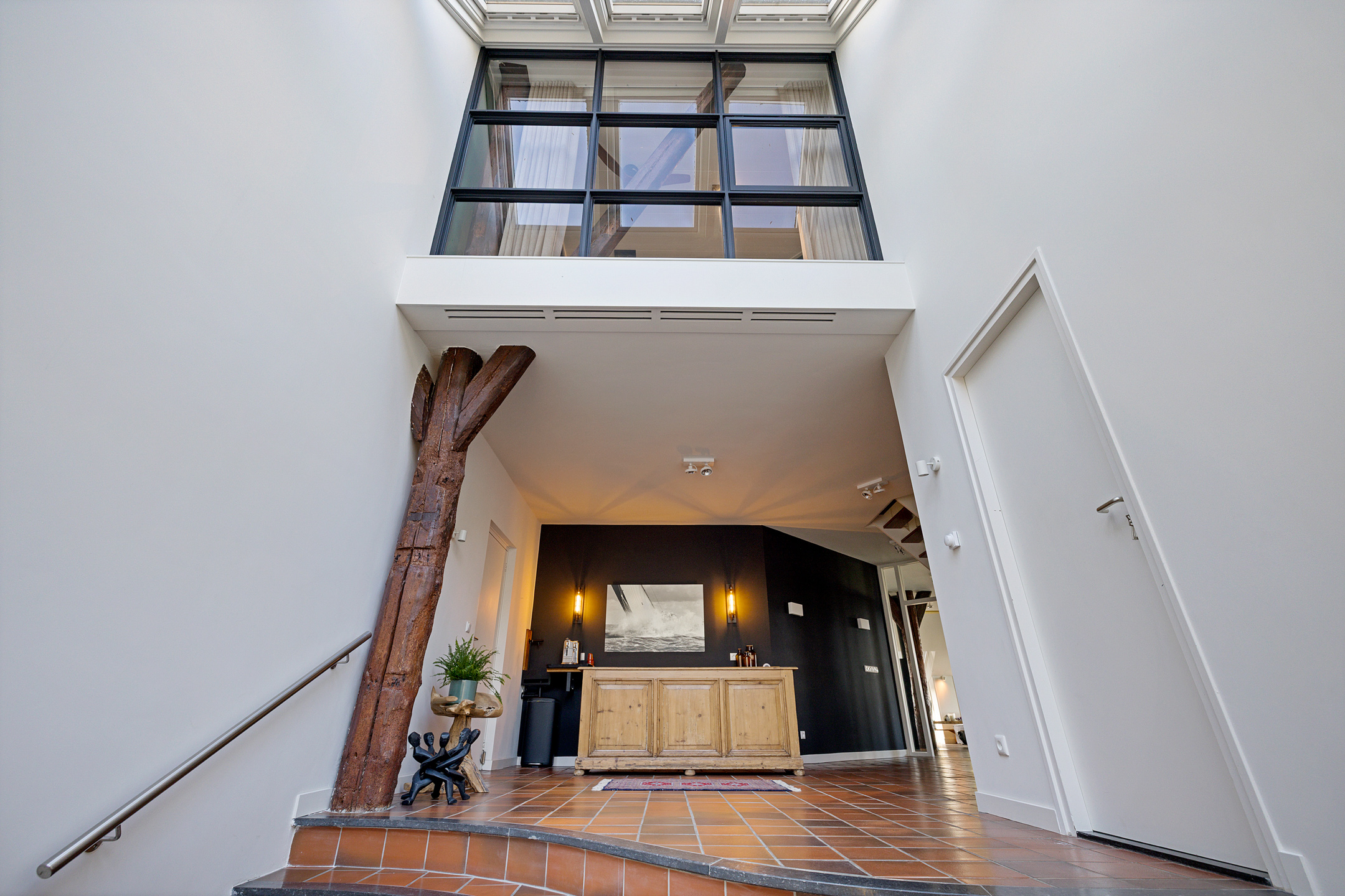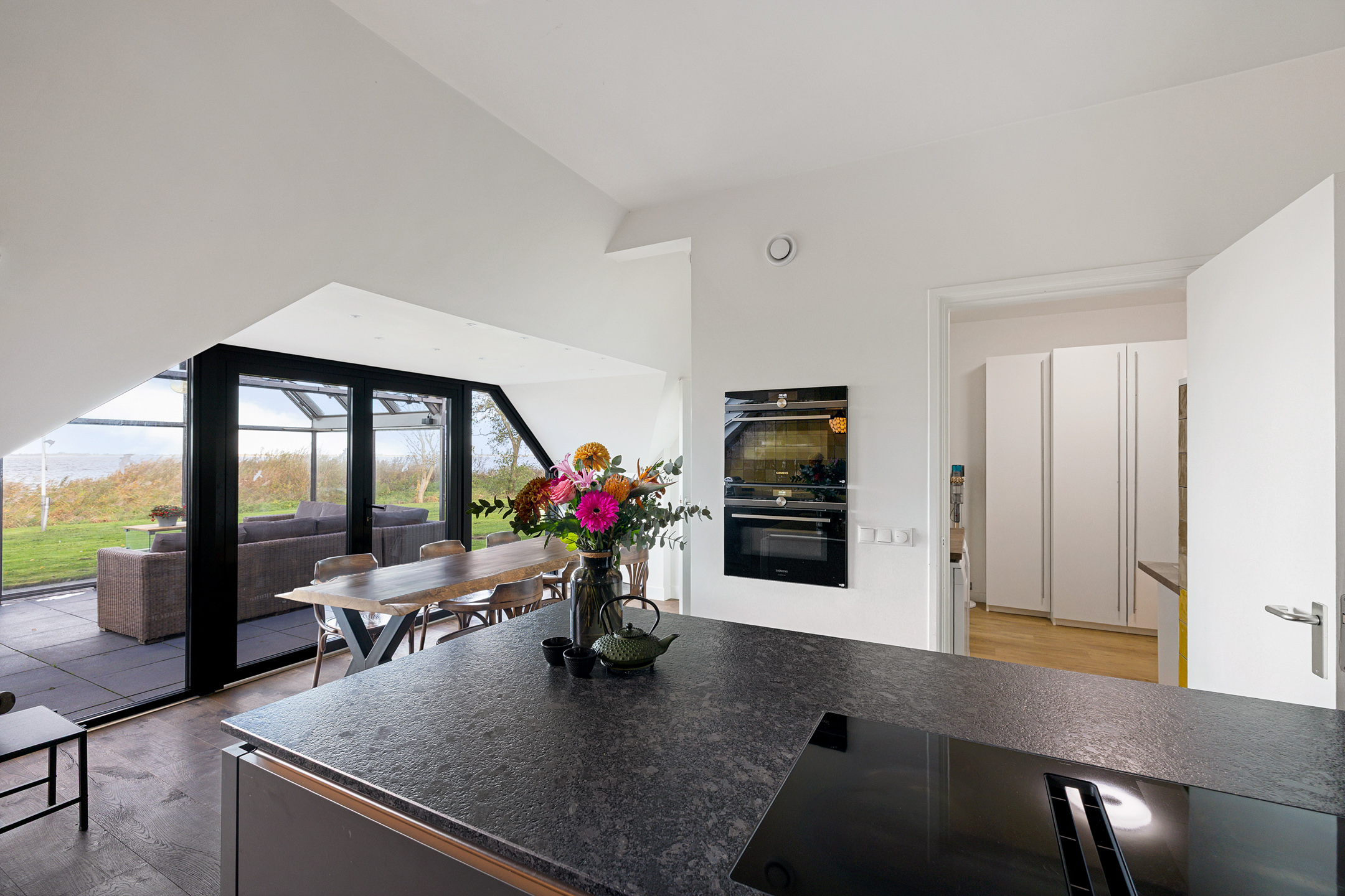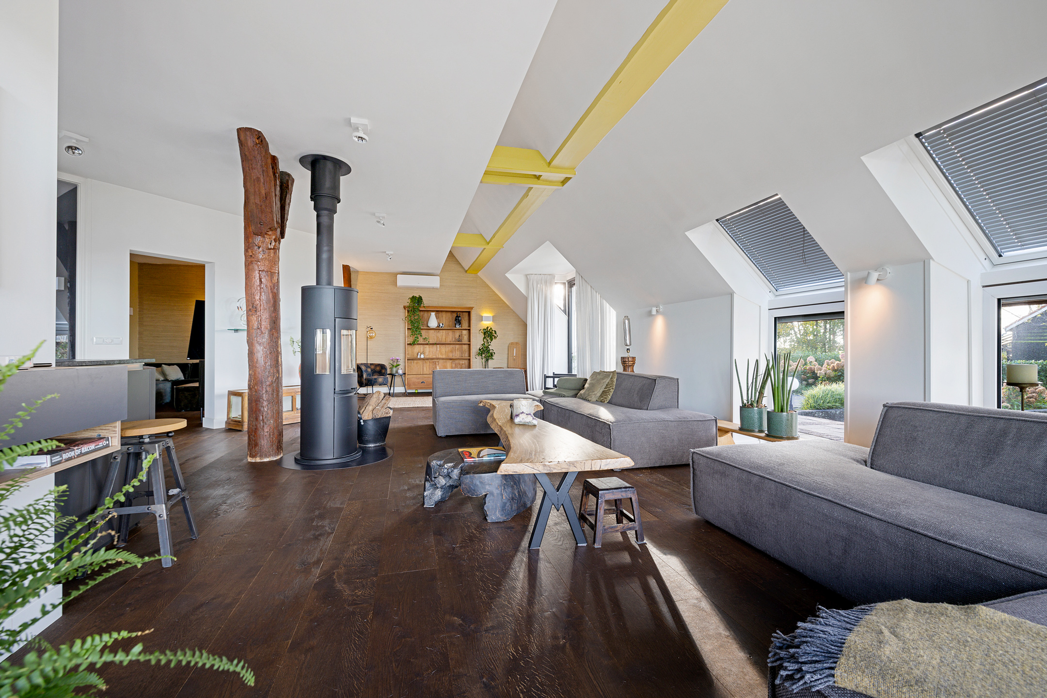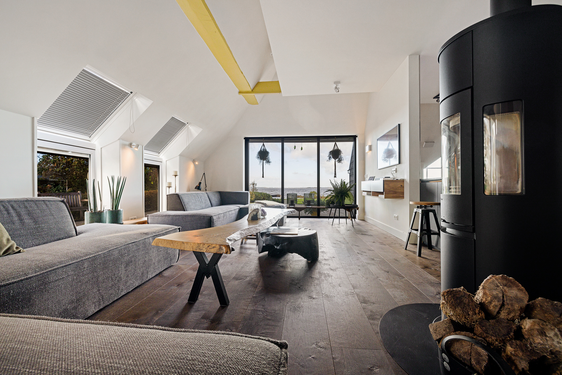 Het achterhuis, iets verhoogd gelegen, biedt een panoramisch uitzicht over het water. De woonkamer van 75,5 m² ademt ruimte en warmte dankzij de open haard, grote raampartijen en vloeiende verbinding met de tuin. De luxe keuken is volledig uitgerust met topapparatuur en vormt het hart van het huis. Vanuit de eetkamer openen de dubbele deuren naar een besloten buitenserre – een verlengstuk van het wonen, beschut en sfeervol.