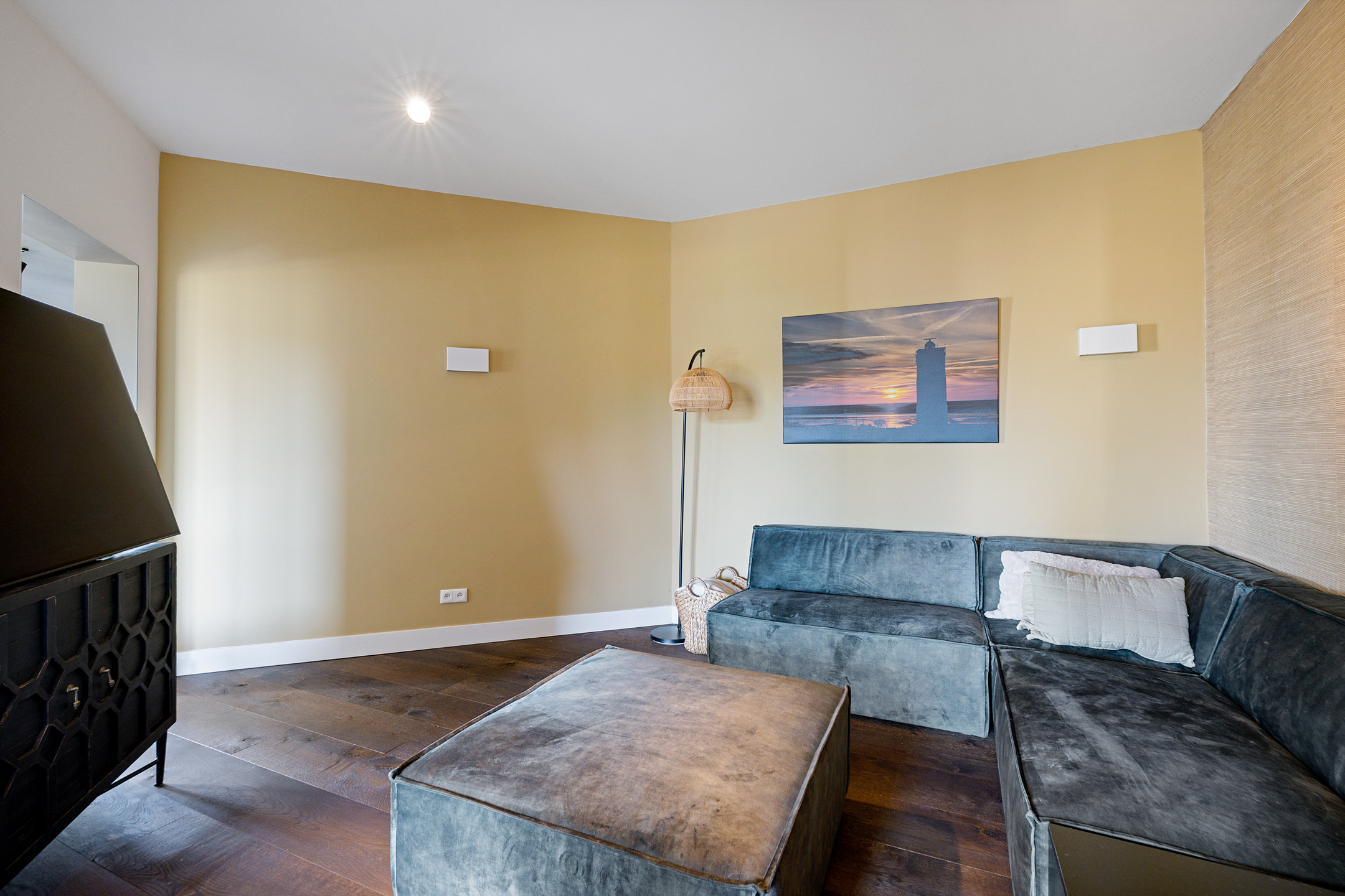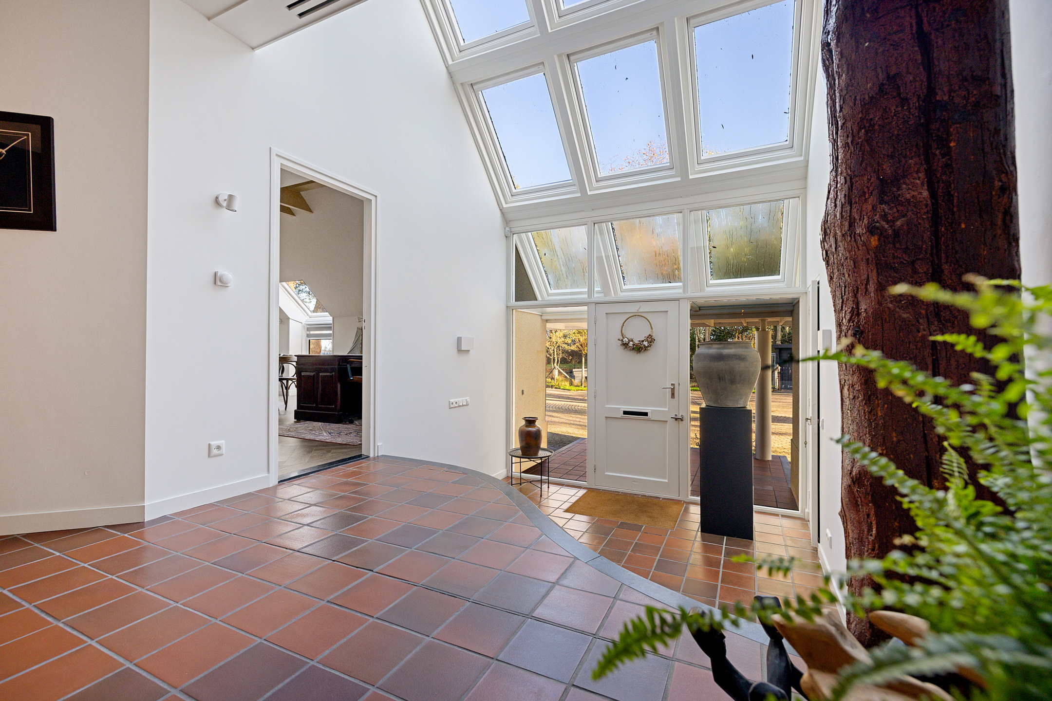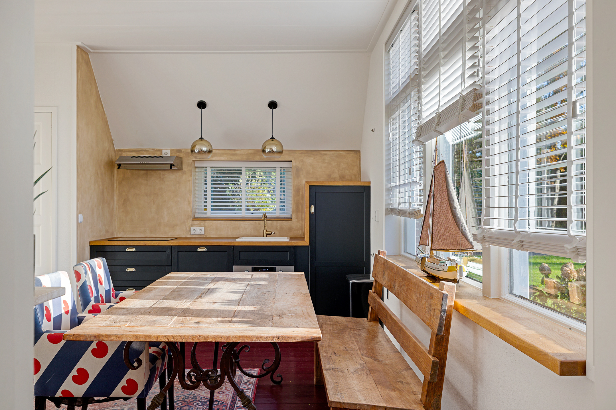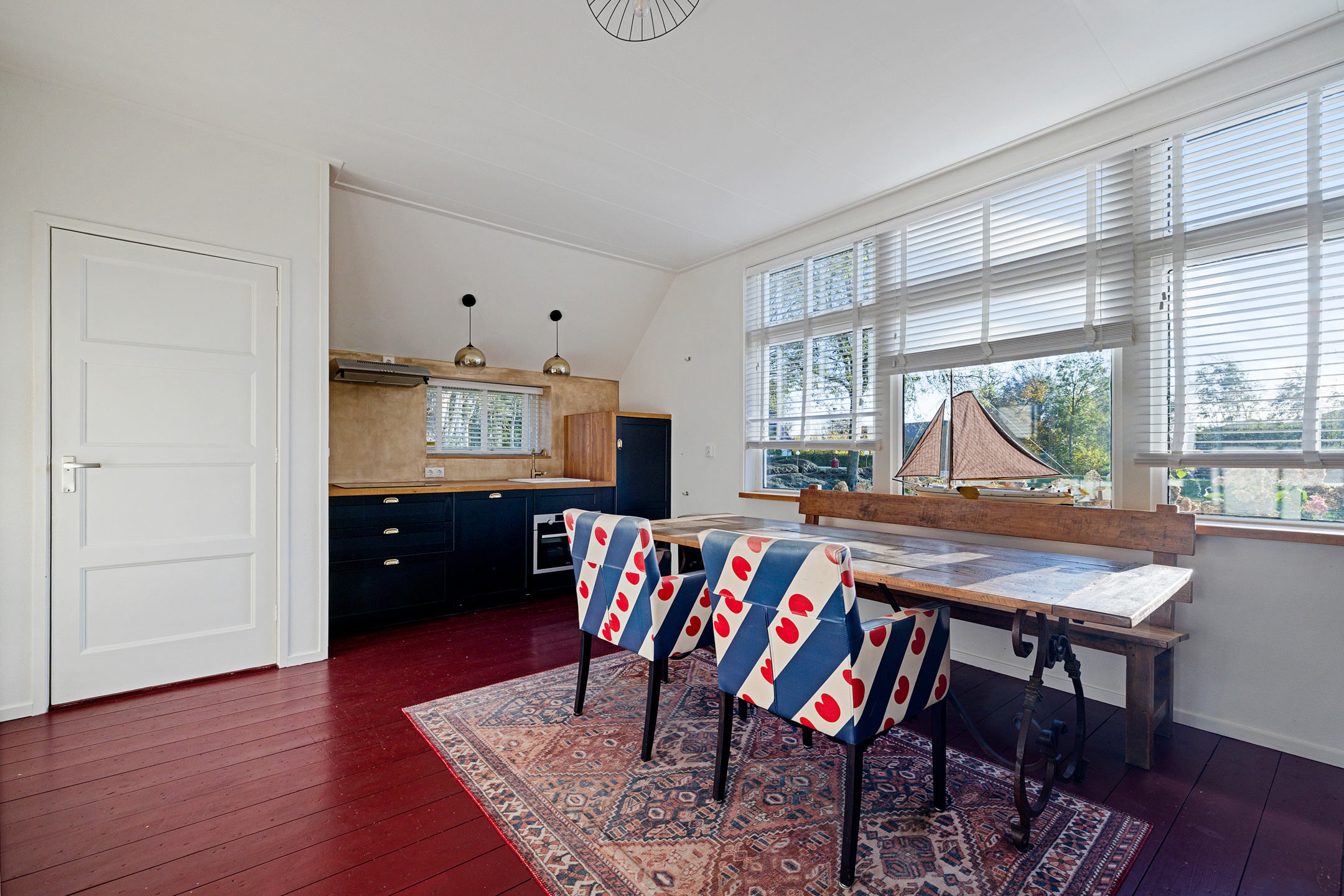 Het achterhuis, iets verhoogd gelegen, biedt een panoramisch uitzicht over het water. De woonkamer van 75,5 m² ademt ruimte en warmte dankzij de open haard, grote raampartijen en vloeiende verbinding met de tuin. De luxe keuken is volledig uitgerust met topapparatuur en vormt het hart van het huis. Vanuit de eetkamer openen de dubbele deuren naar een besloten buitenserre – een verlengstuk van het wonen, beschut en sfeervol.