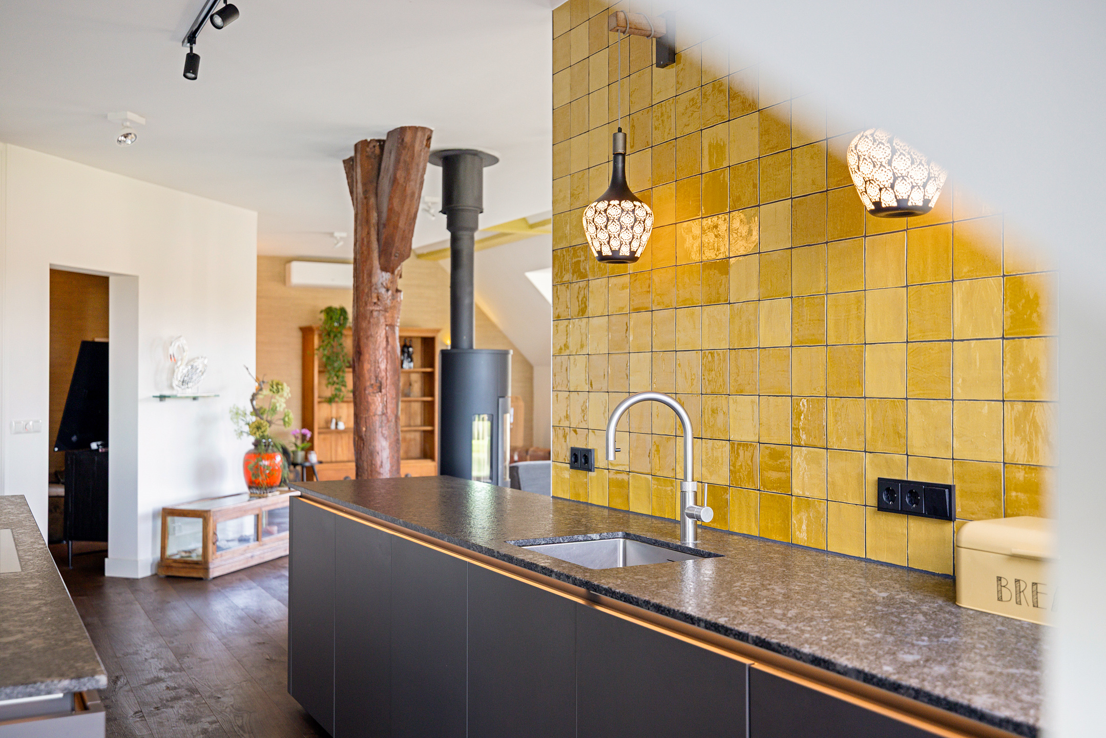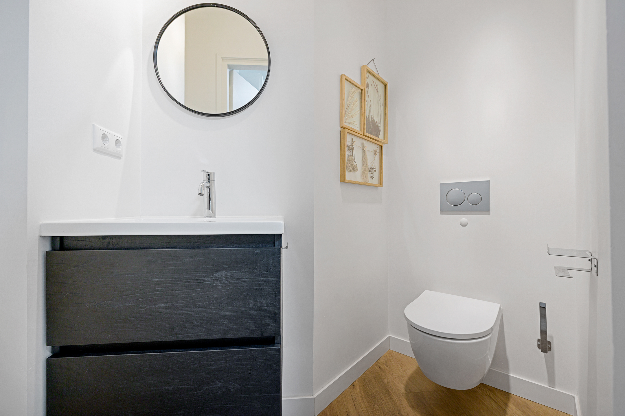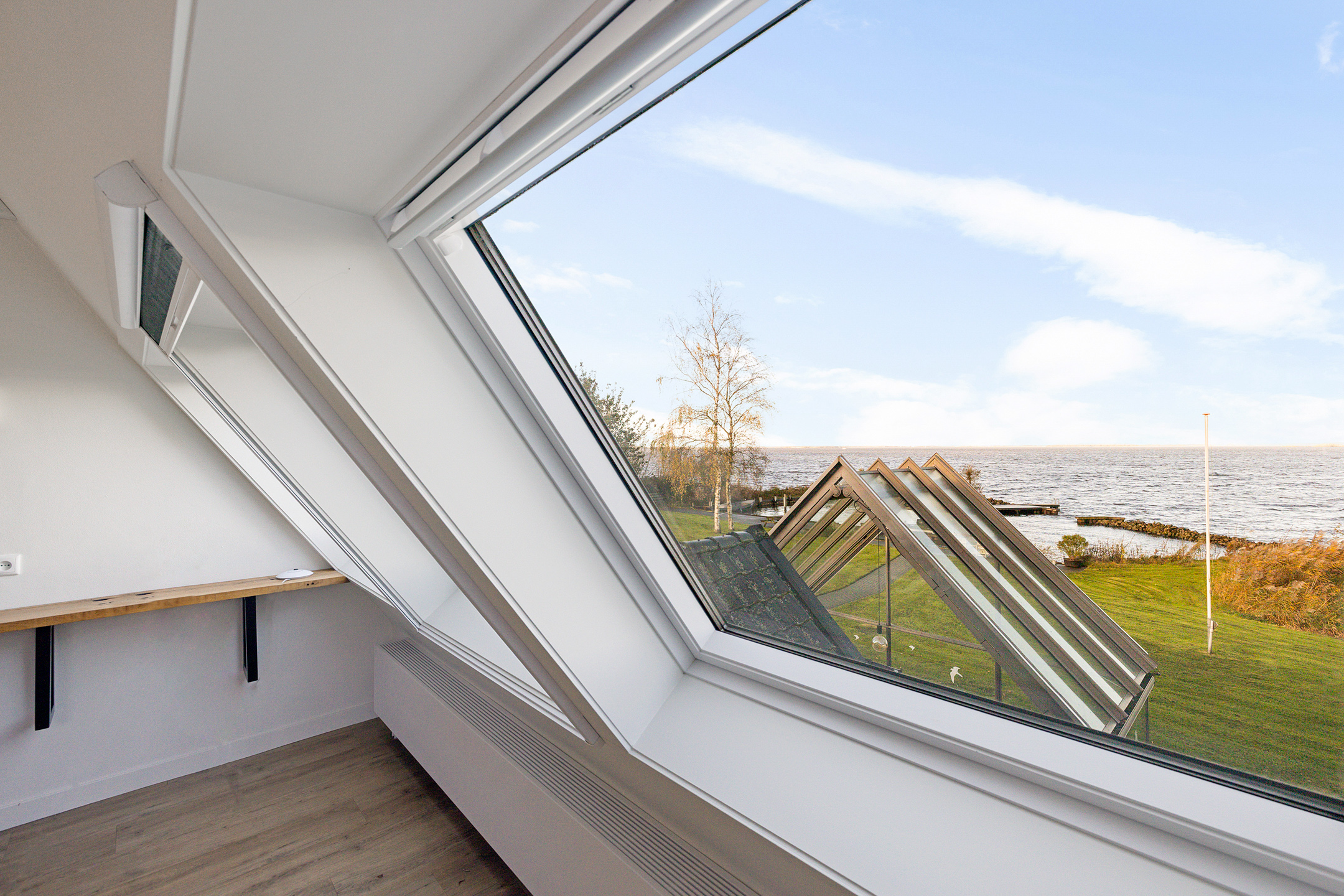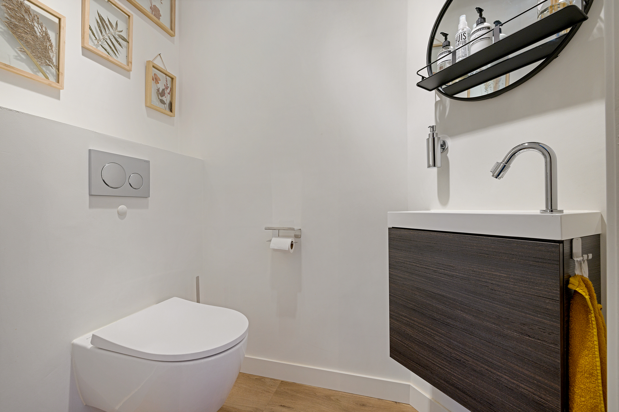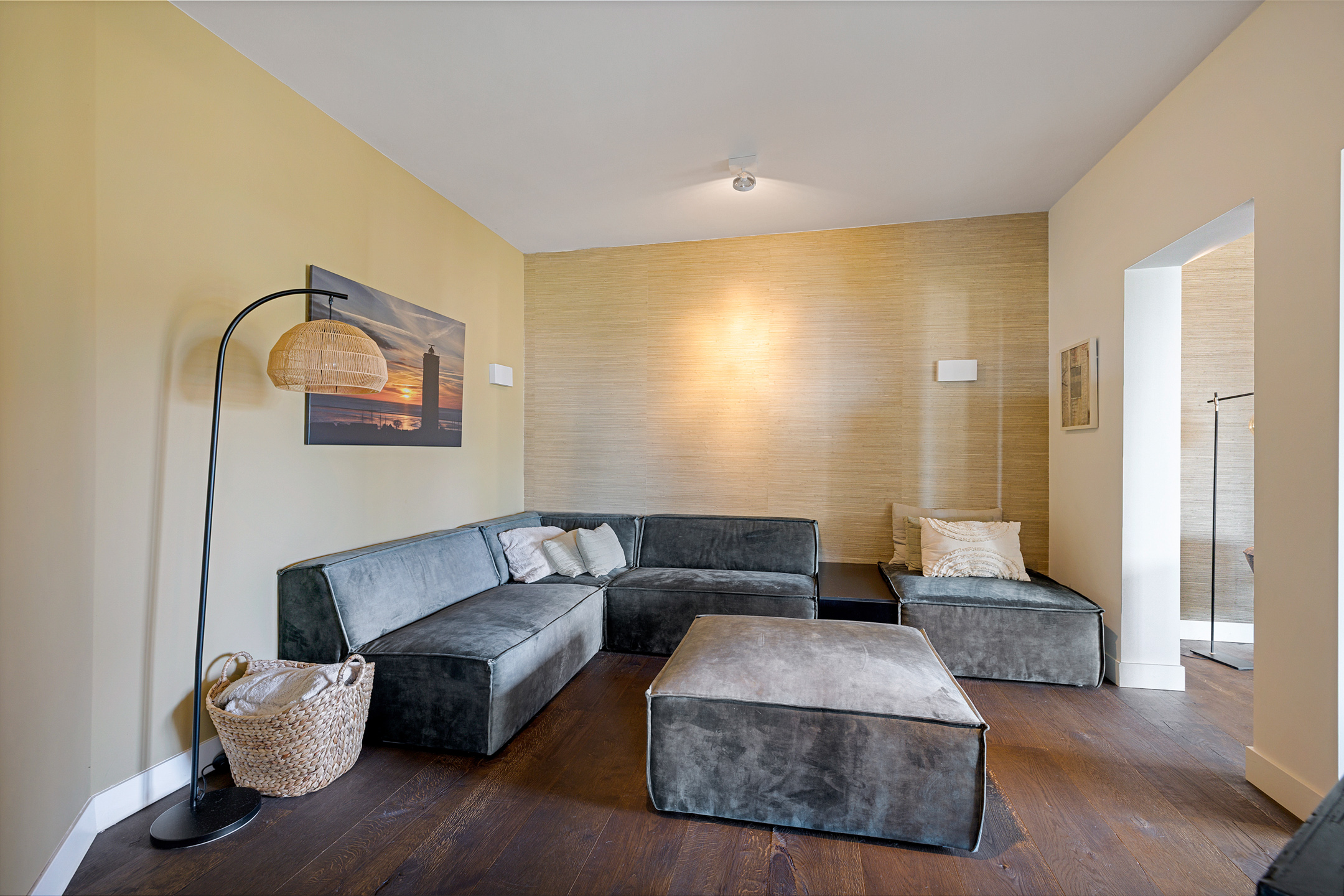 Het achterhuis, iets verhoogd gelegen, biedt een panoramisch uitzicht over het water. De woonkamer van 75,5 m² ademt ruimte en warmte dankzij de open haard, grote raampartijen en vloeiende verbinding met de tuin. De luxe keuken is volledig uitgerust met topapparatuur en vormt het hart van het huis. Vanuit de eetkamer openen de dubbele deuren naar een besloten buitenserre – een verlengstuk van het wonen, beschut en sfeervol.