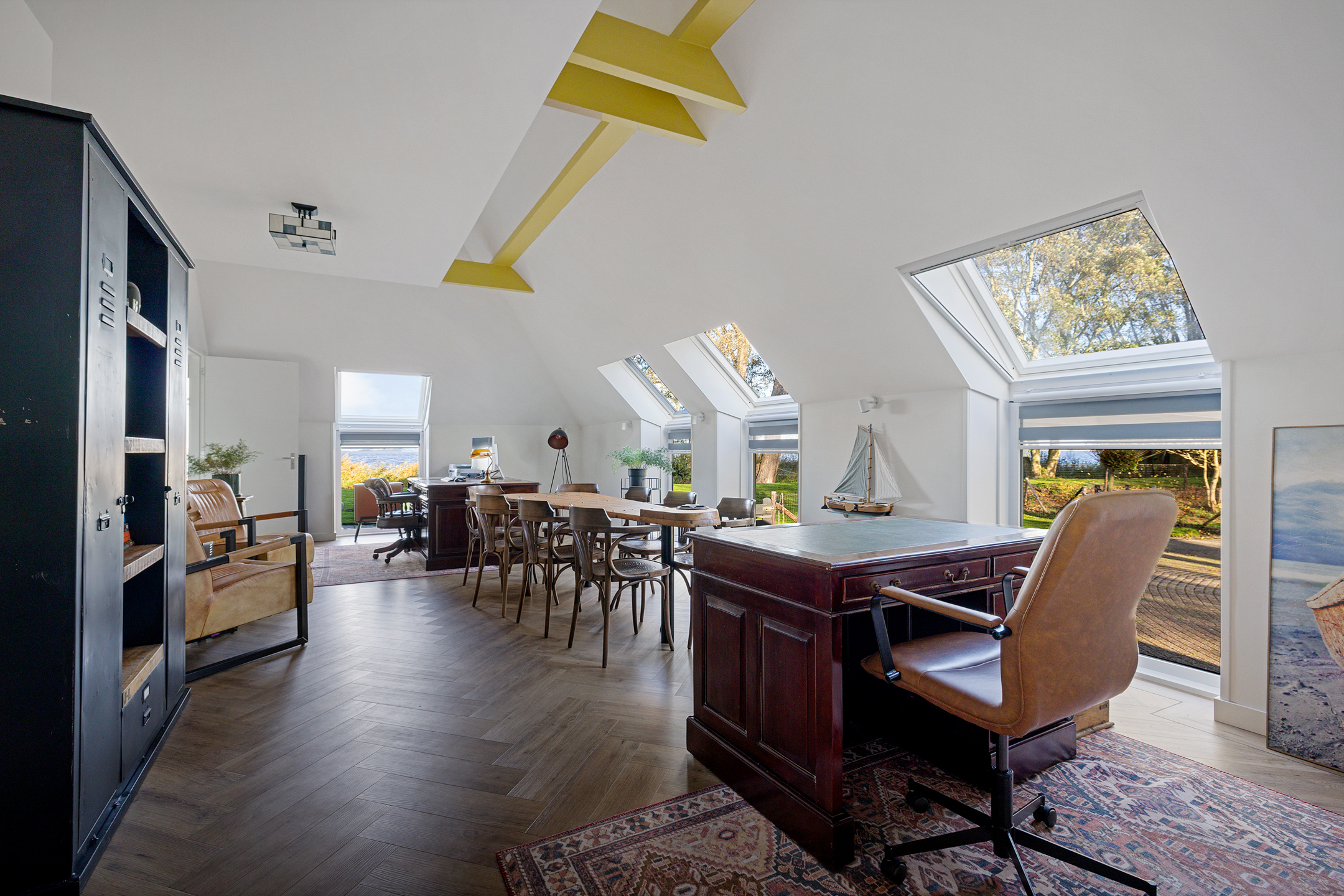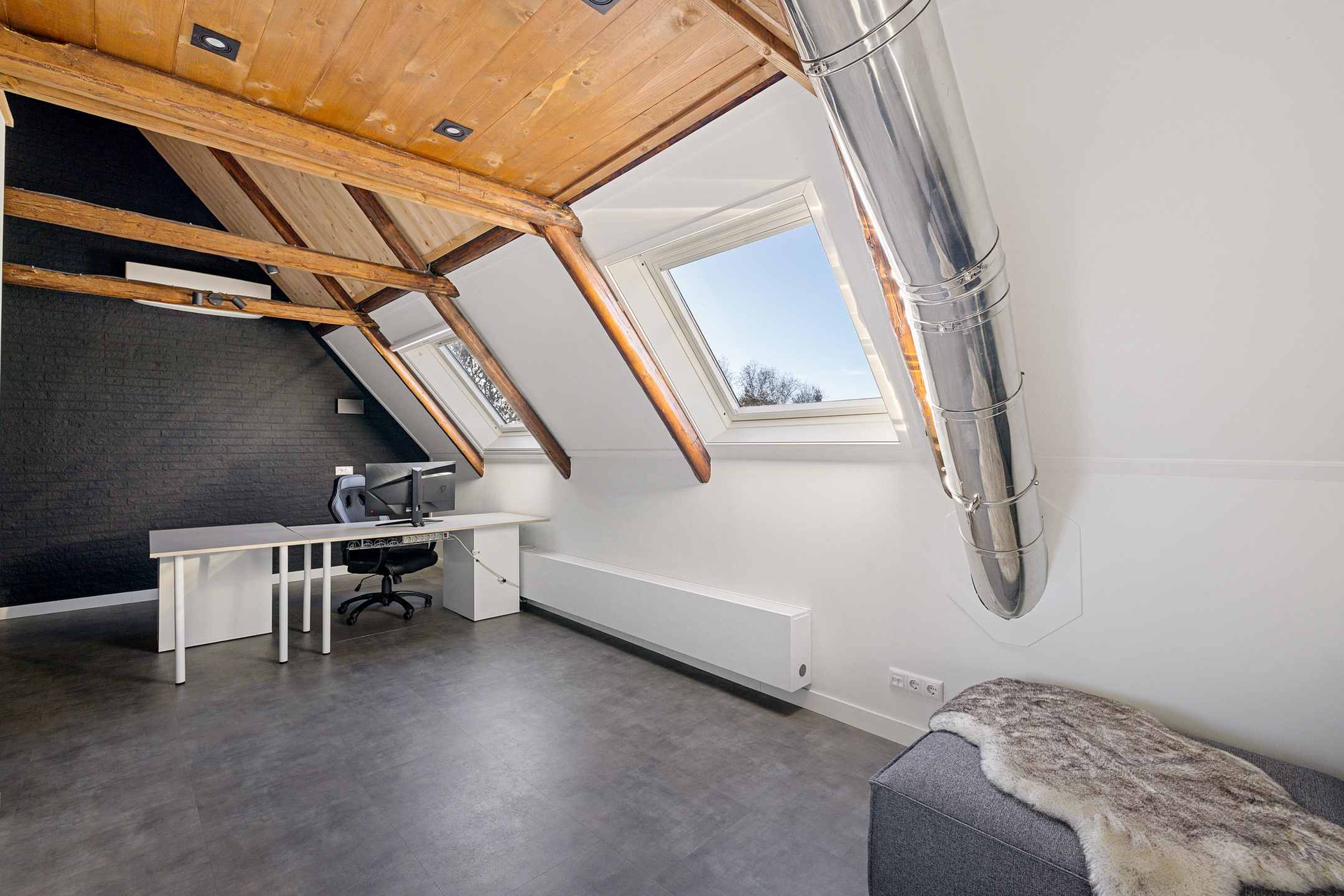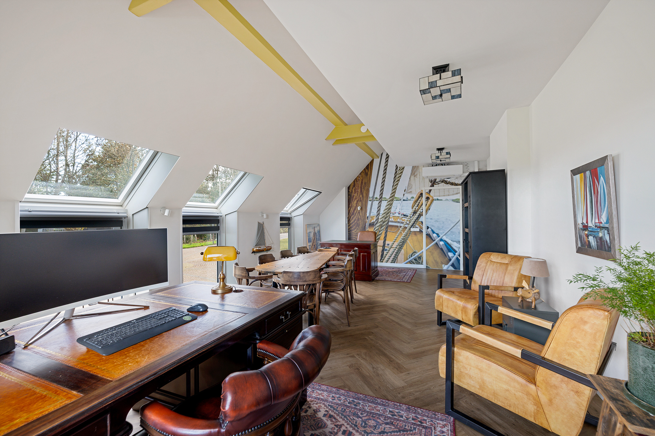 Aangrenzend ligt een royale ruimte van 38 m², nu in gebruik als kantoor, maar ook perfect als atelier, speelruimte of gastenverblijf.
