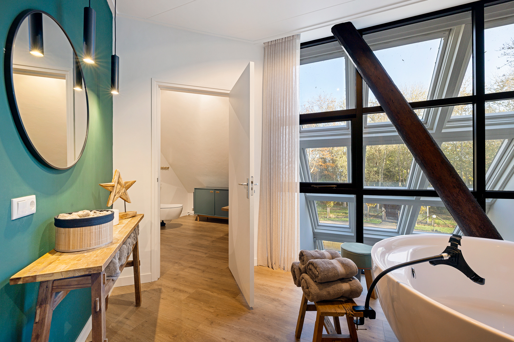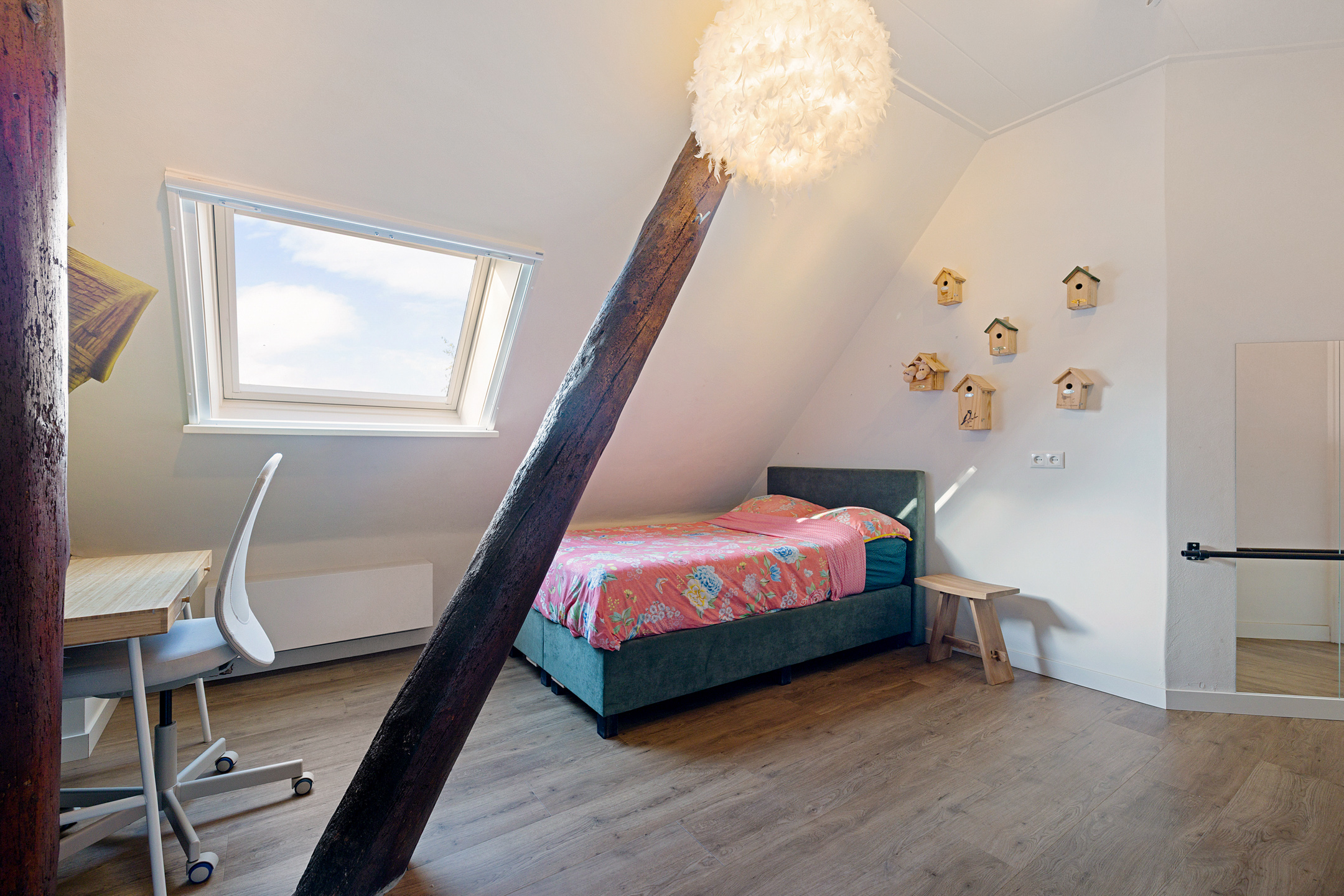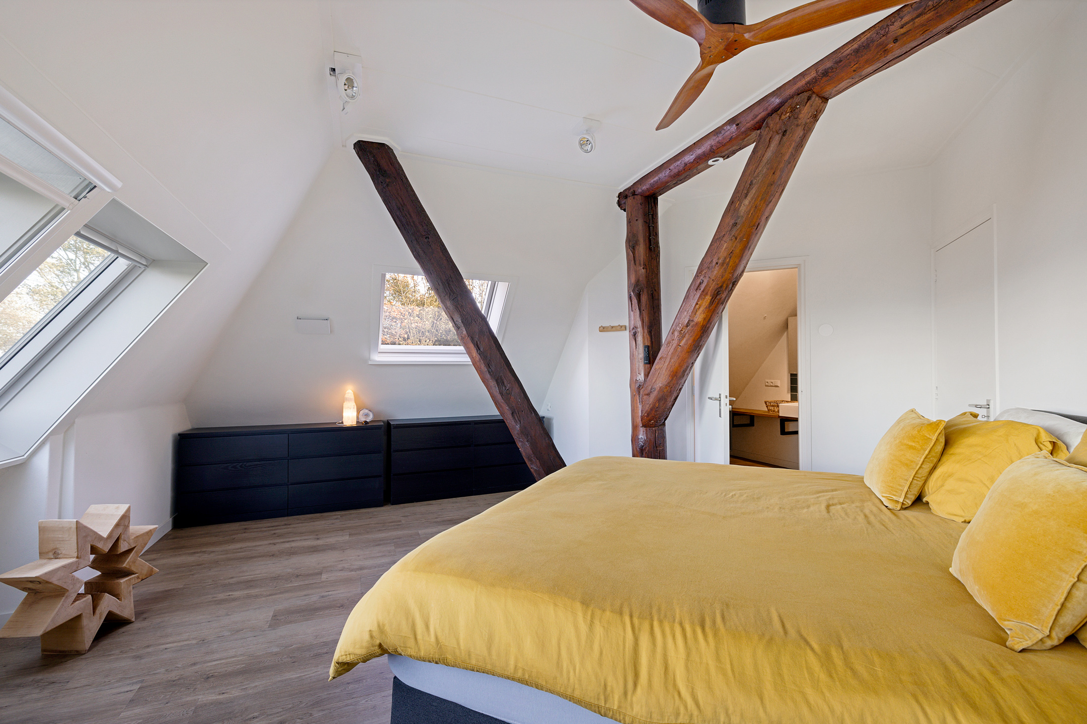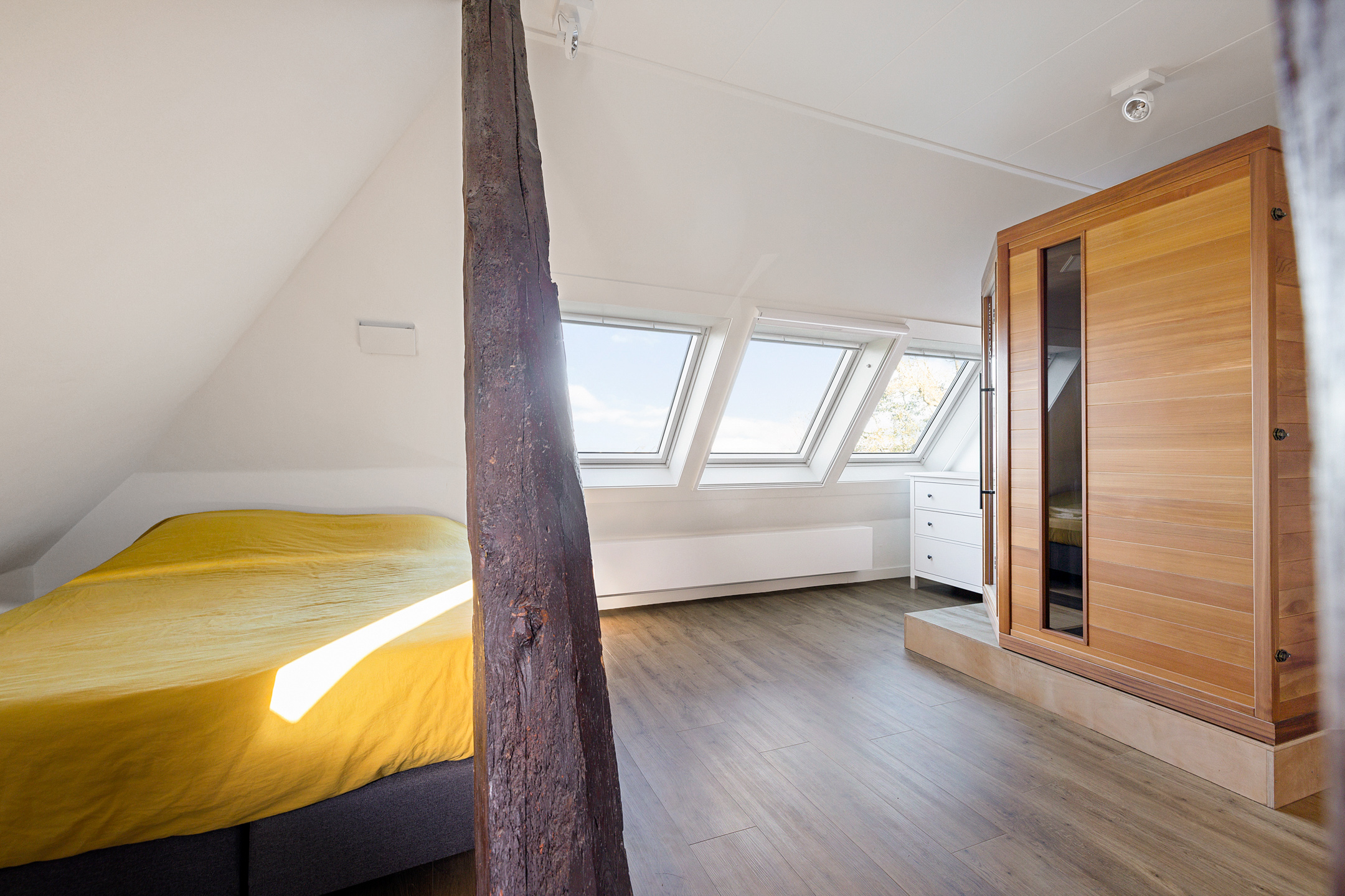 Op de eerste verdieping bevinden zich drie ruime slaapkamers, waarvan één met sauna, twee badkamers (één met een groot rond ligbad) en een apart toilet. De originele gebinten van de oude stal geven de verdieping karakter en historie. Een vaste trap leidt naar de tweede etage met nog een vierde slaapkamer.