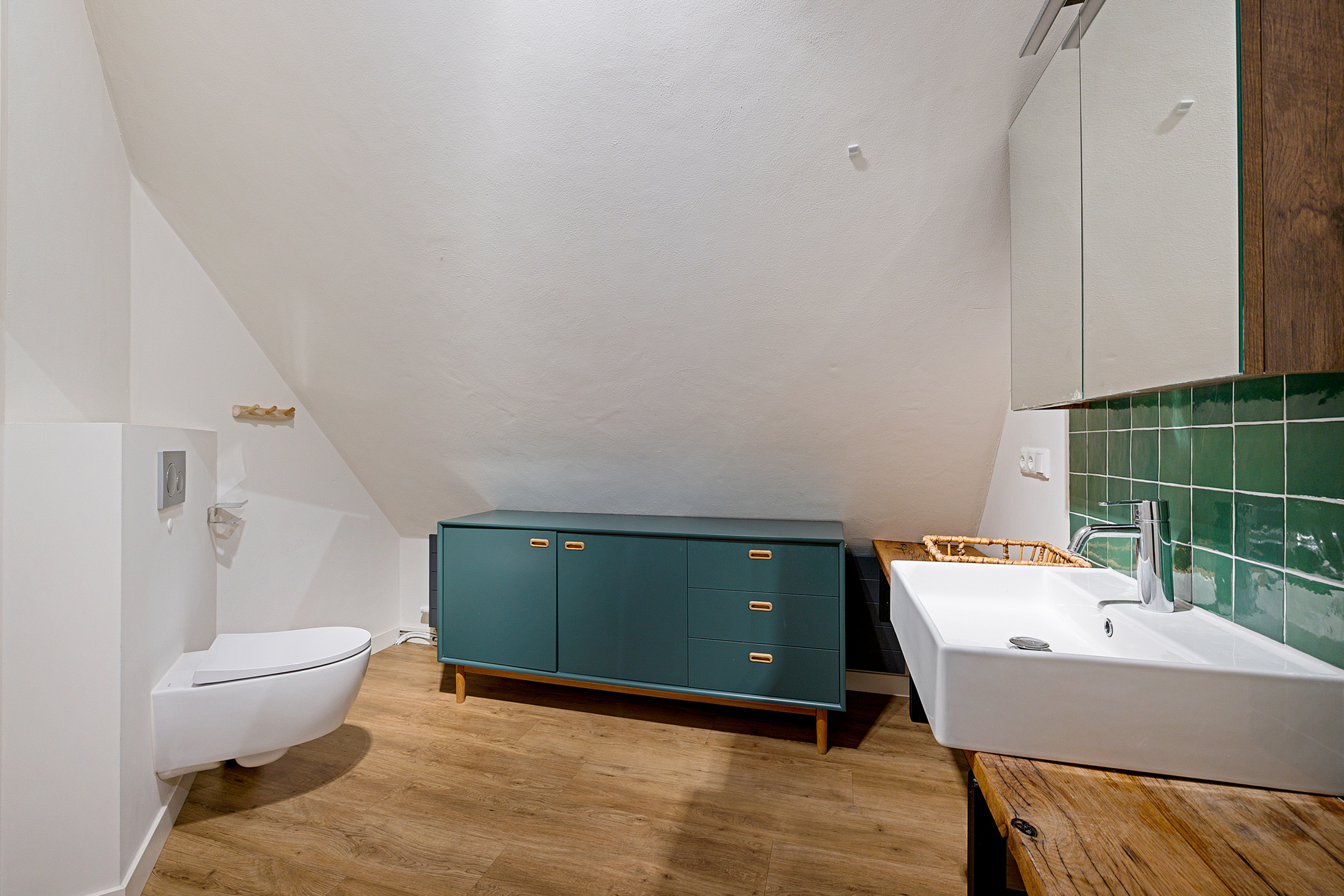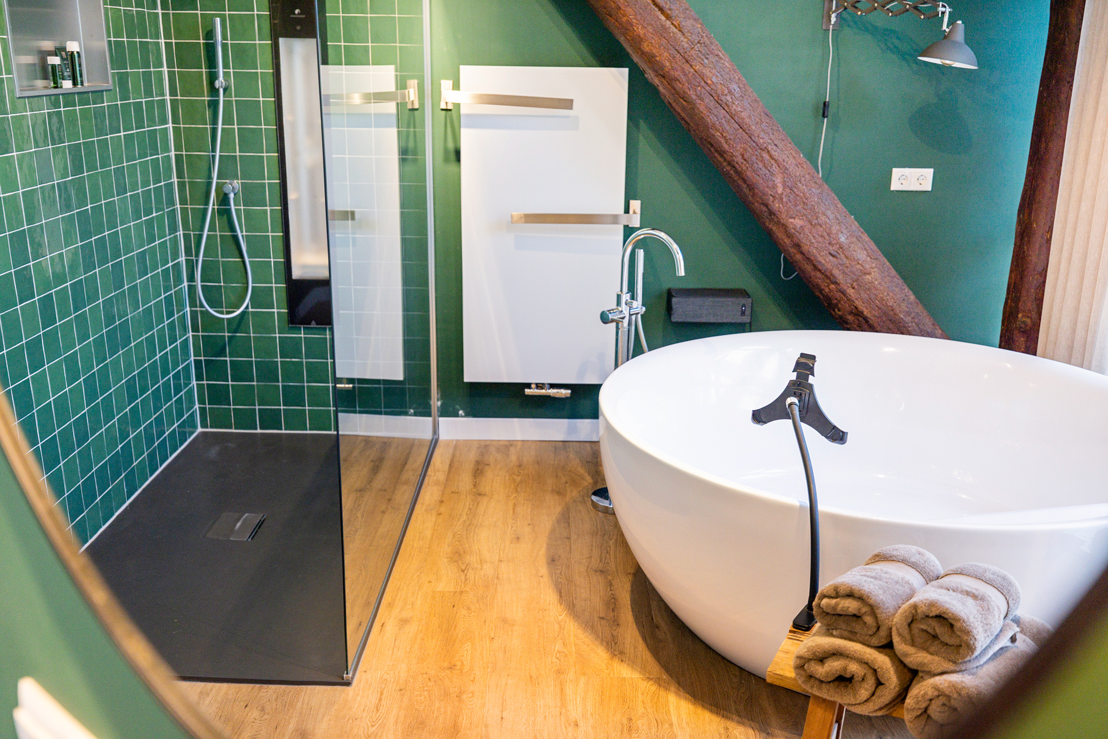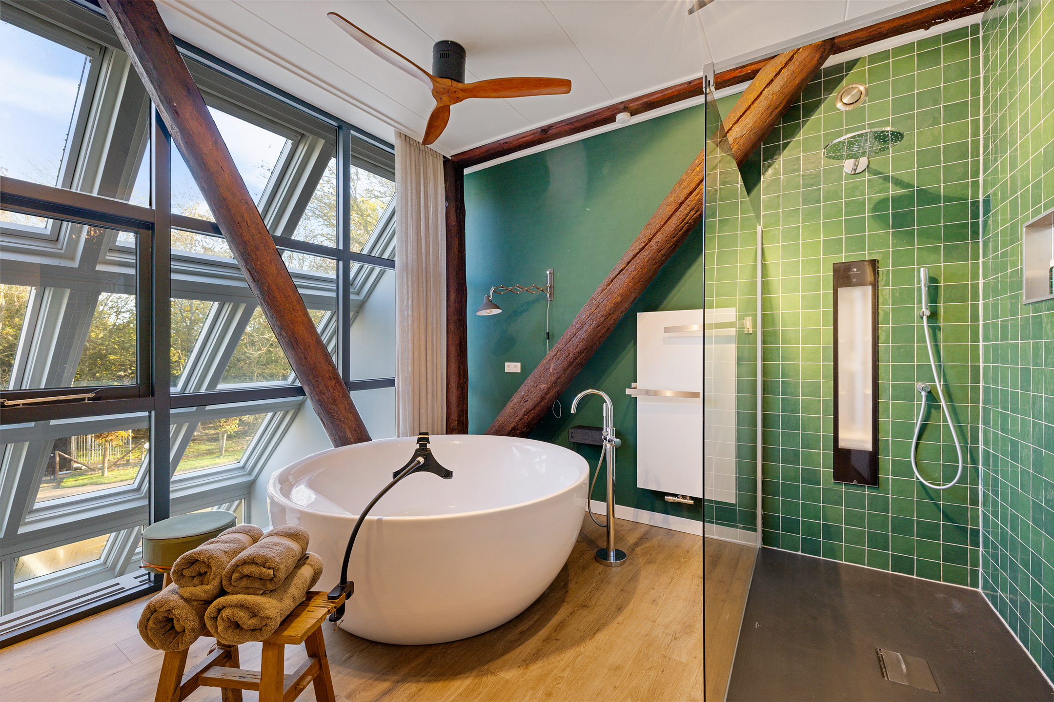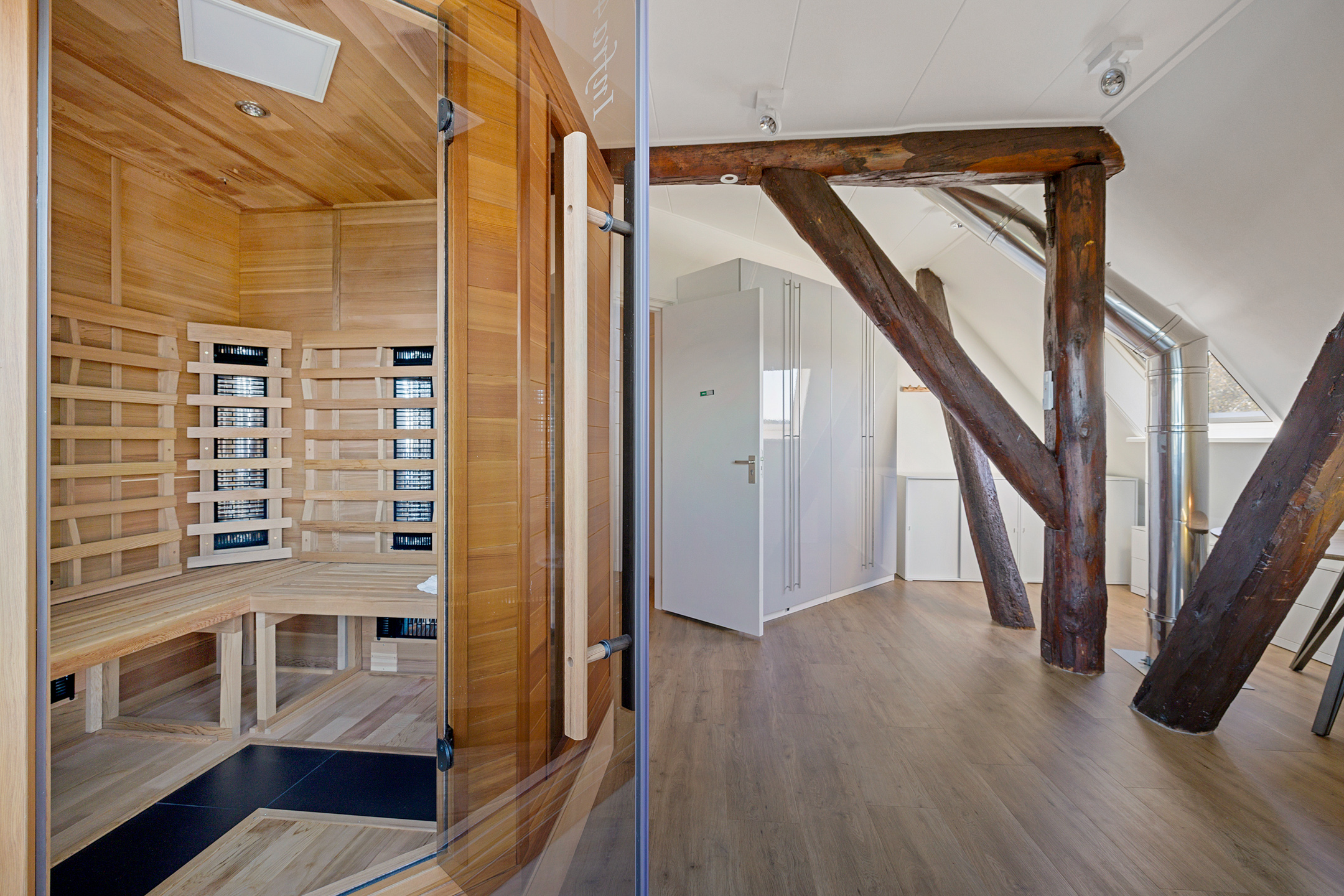 Op de eerste verdieping bevinden zich drie ruime slaapkamers, waarvan één met sauna, twee badkamers (één met een groot rond ligbad) en een apart toilet. De originele gebinten van de oude stal geven de verdieping karakter en historie. Een vaste trap leidt naar de tweede etage met nog een vierde slaapkamer.